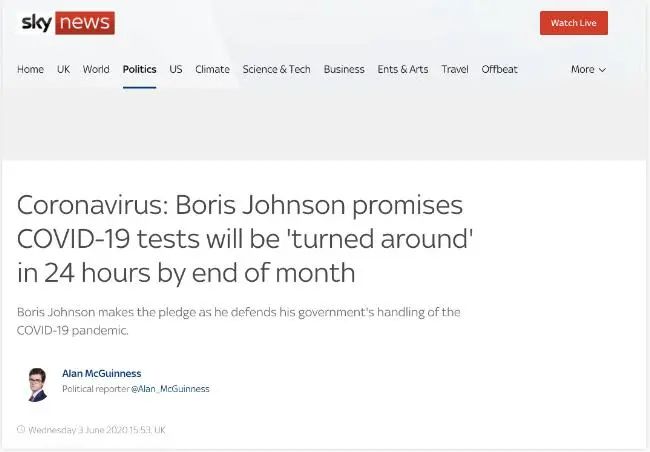 英国首相鲍里斯今天宣布,英国政府将在6月底前,达成所有新冠核酸测试(需要邮寄的测试除外)在24小时之内就出结果的新目标。