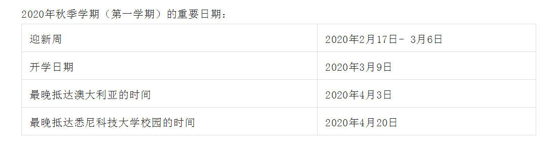 澳大利亚政府最新公布的临时旅行限制将延长至 2 月 29 日。学校 了解到一些同学可能正在考虑延期入学或取消已选课程。 悉尼科技大学鼓励大家可以继续注册入读你的课程,我们有信心为你提供必要的安排,使你可以正常进行 你的 2020 年秋季学期(第一学期)的学习。