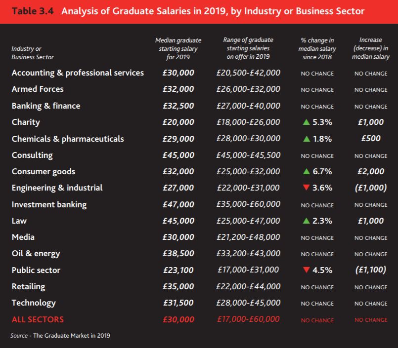 2019的年度慷慨雇主来自投行(4.7万英镑),律师事务所(4.5万英镑),咨询公司(4.5万英镑),石油和能源公司(3.85万英镑),零售商给的3.5万英镑也算不少。往后我们会再简单介绍一下不同行业的起薪。