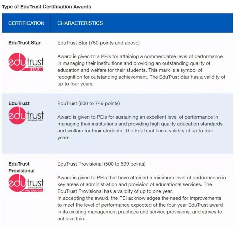 为了保证新加坡私立学校的质量,新加坡政府推出了eu-trust认证(教育信托认证)。