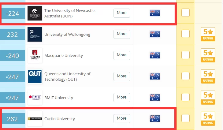 通过与去年的qs世界大学排名表对比,我们可以很清楚的看出,澳大利亚纽卡斯尔大学和科廷大学较去年均有提升,其中,澳大利亚纽卡斯尔大学较2018年排名提升10位,科廷大学较2018年排名提升12位。当然并不是所有大学在排名上都有较大提升,有些学校侧重点不同。比如莫多克大学是注重毕业生就业能力的,是比较新的大学。詹姆斯库克大学是研究型大学,特色专业心理学,水产环境学等。