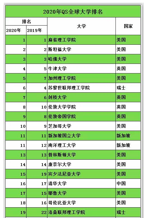 qs2020年排名的前10位大学与去年相同,只是位次稍有变化。