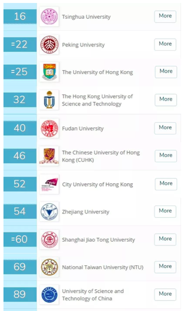 台湾大学 ntu上升3名至69位,超过大阪大学(71)。 中国科学技术大学 上升9名至全球第89名, 香港理工大学 上升15名进入全球百强(91名)。