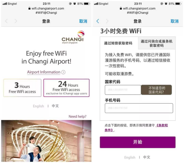 飞机落地后,著名的新加坡樟宜机场是全网络覆盖,同学可以关闭网络漫游,只需打开网络浏览器 (如苹果手机的safari浏览器、谷歌chrome浏览器或者ie浏览器等) ,输入一个有效的网站地址,便可以打开网络登录页面,获取登录密码的方式有如下几种: