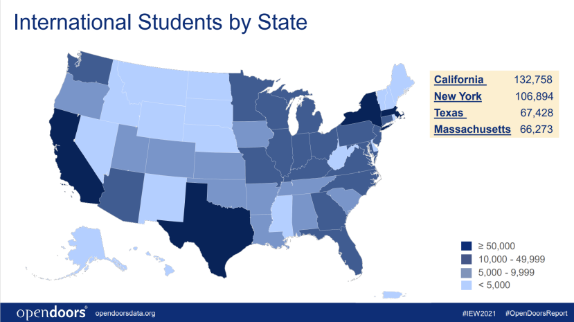 根据报告显示加州仍然国际学生的首选之地,加州北部有硅谷,南部有好莱坞,气候宜人,经济发达,且教育资源丰富,斯坦福大学,加州理工,加州大学伯克利分校,加州洛杉矶分校,加州大学圣塔芭芭拉分校,加州大学圣地亚哥分校,加州大学旧金山分校,南加州大学等等都聚集于此。排名第2的是纽约州,这里有著名的华尔街,第五大道,百老汇,联合国总部等等,高校哥伦比亚大学,纽约大学,康奈尔大学,罗切斯特大学等等;第3名是德州,高校莱斯大学,德州大学奥斯汀分校,南卫理公会大学,贝勒大学,德州农工大学等,第4名是麻省,这里高校云集,有哈佛大学,麻省理工学院,波士顿大学,塔夫斯大学,波士顿学院,布兰迪斯大学,东北大学,伍斯特理工等。伊利诺伊州,宾夕法尼亚州,佛罗里达州,密歇根州和印第安纳州分列5-9名。