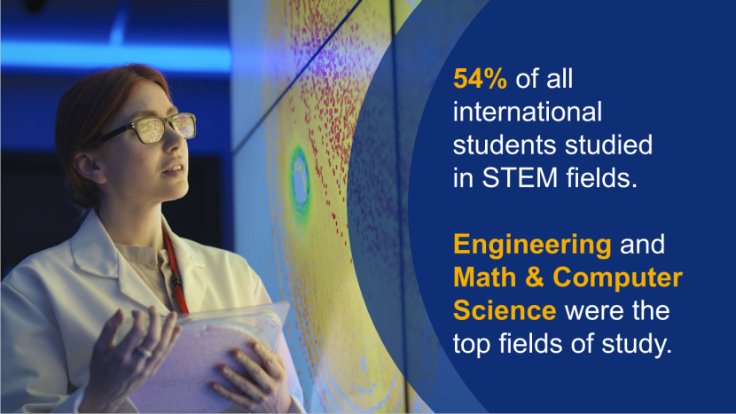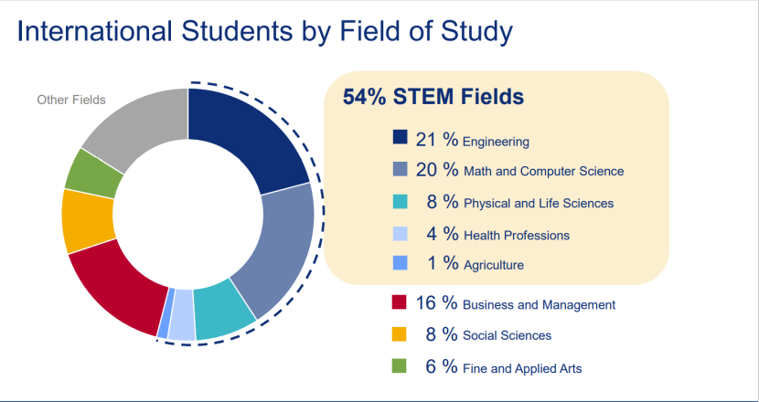 在就读专业方面,STEM专业成为国际学生的最爱,54%的国际学生选择了就读STEM专业,工程类专业选择人数最多,高达21%;其次是数学和计算机类专业,占20%;排名第3的是商业与管理类专业 16%, 社会科学类与物理与生命科学类排名并列第四 8%。