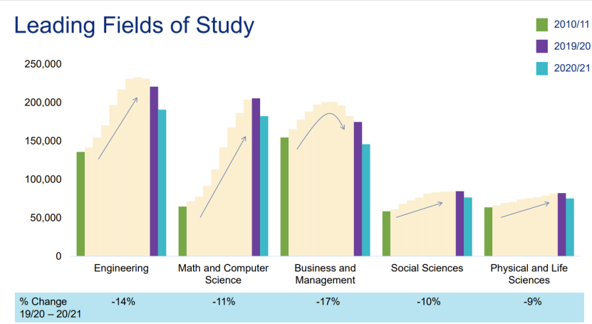 根据报告数据显示,2020至2021学年,美国大学在读国际学生人数914,095人次, 相比上一学年下降15%,占美国高等教育人口4.6%,继上一学年在美高校国际学生人数第一次出现负增长后,再次出现人数负增长且跌幅显著。