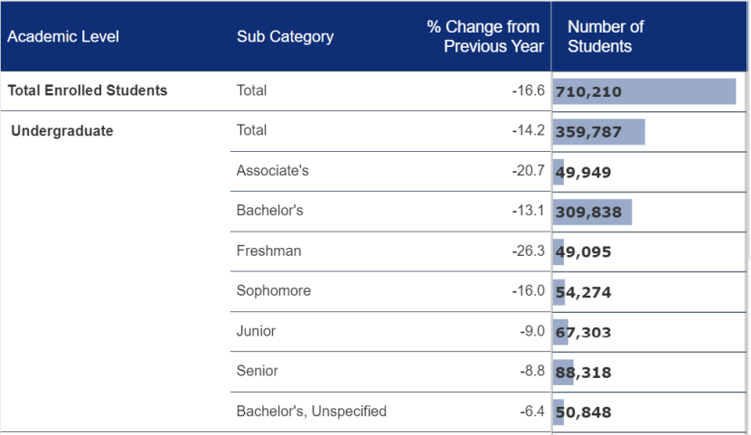 在学习层次上,本科生人数为59,787,占比39%,相比上一学年,下降14%;硕士生人数为166,636,下降达21.1%,博士生人数为132,703,下降2.9%。