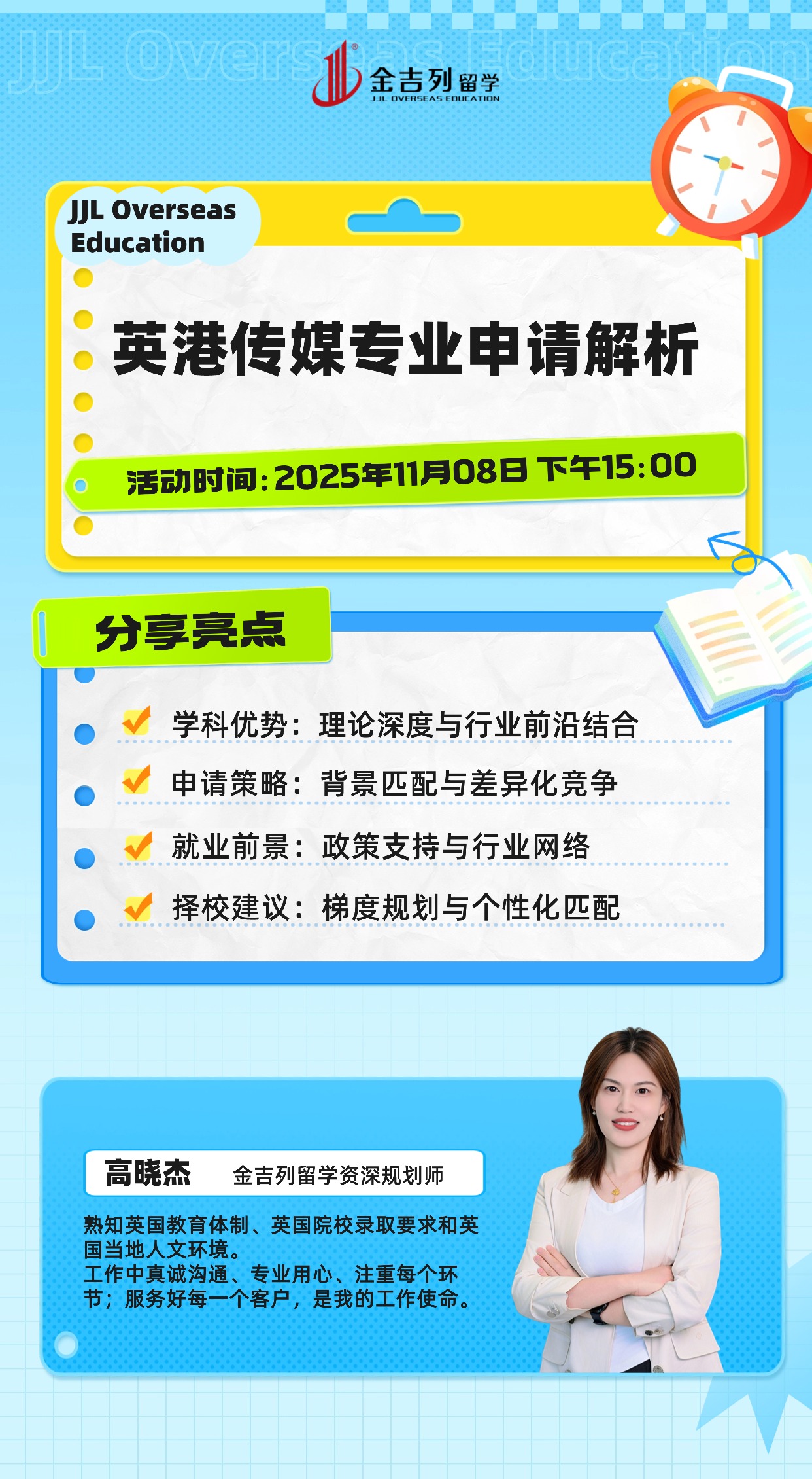 金吉列留学北京分公司重磅推出【英港传媒专业申请解析】活动!欢迎各位同学们积极报名!