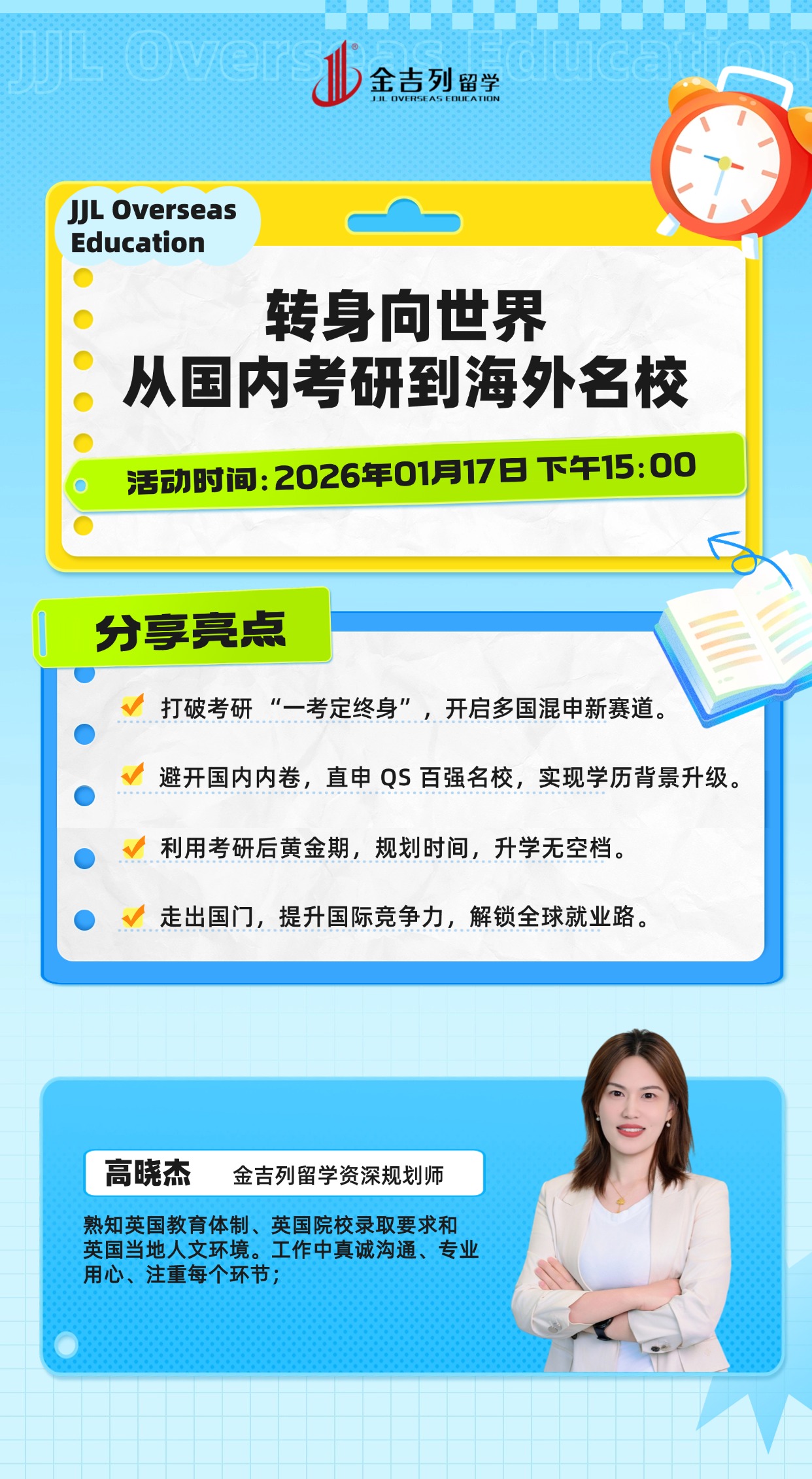 讲座地点:北京市朝阳区建国门外大街甲8号 北京国际财源中心东塔B座15层金吉列留学活动时间:2026-01-17 15:00