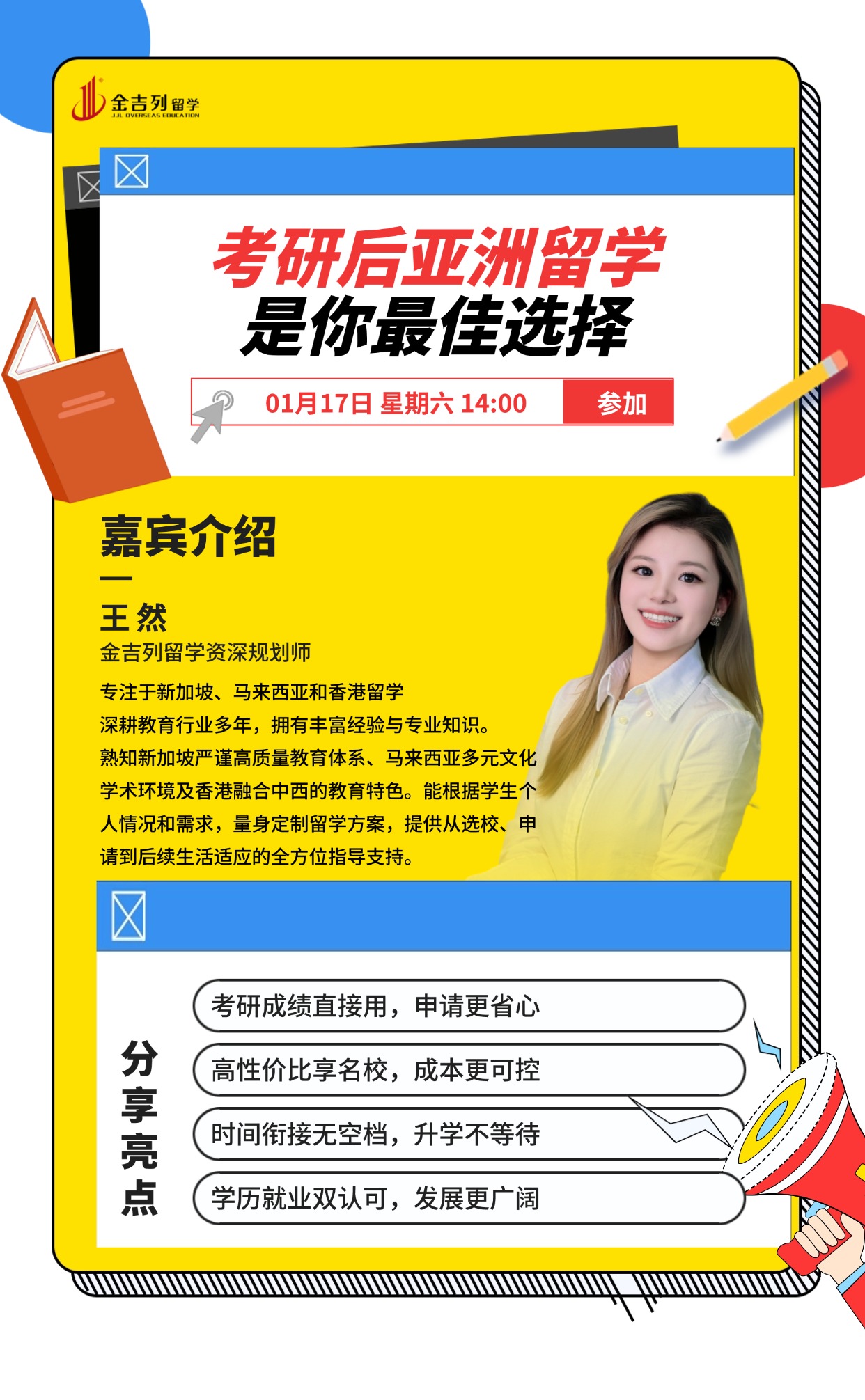 讲座地点:北京市朝阳区建国门外大街甲8号 北京国际财源中心东塔B座15层金吉列留学活动时间:2026-01-17 14:00