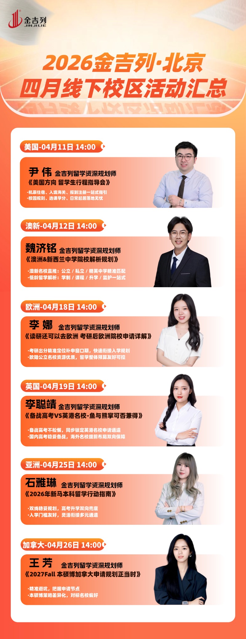 讲座地点:北京市朝阳区建国门外大街甲8号北京国际财源中心东塔B座15层金吉列留学活动时间:2026-04-11 14:00