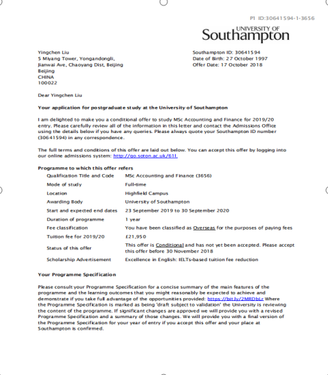 录取专业:MSc Accounting an Finance