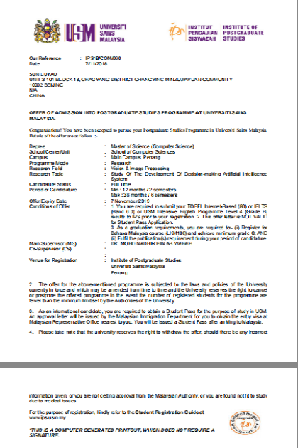 马来西亚理科大学录取offer