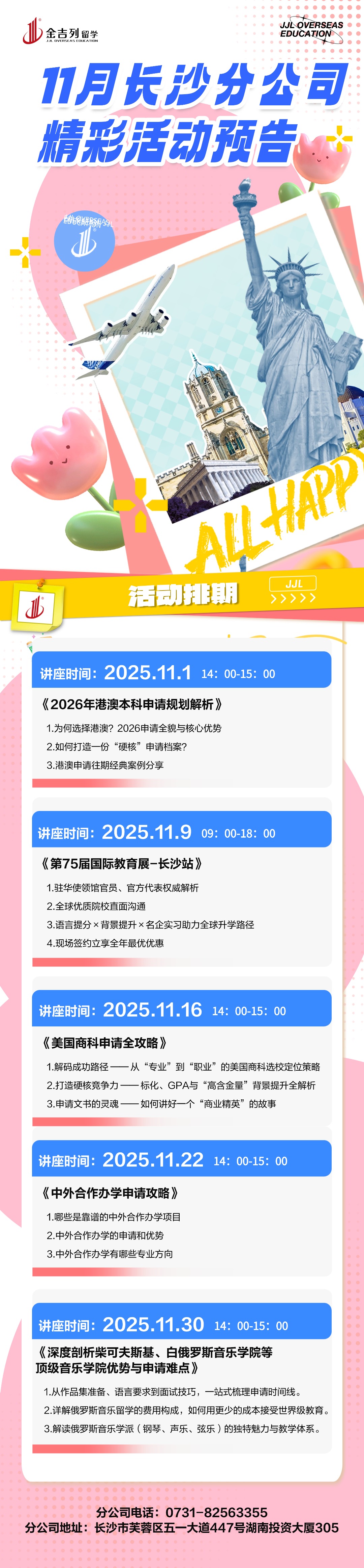 相约金吉列留学长沙分公司,听留学时讯、做申请规划、获行前攻略、享海外生活,精彩多多,不容错过!
