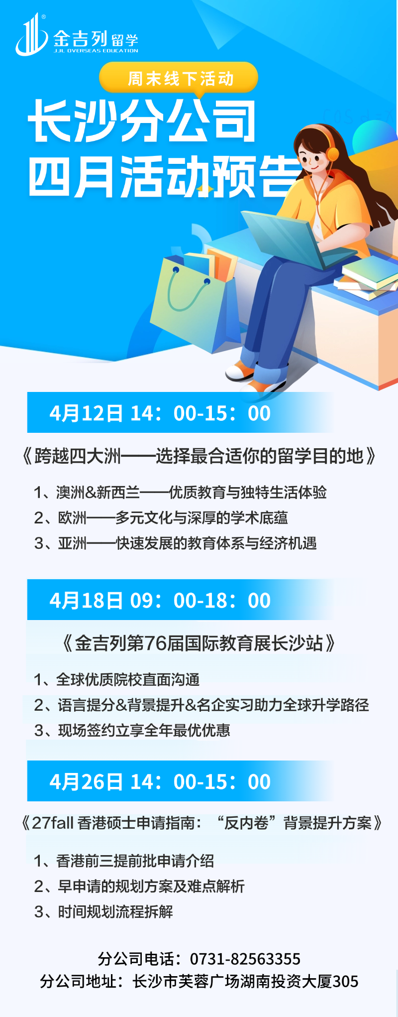 相约金吉列留学长沙分公司,听留学时讯、做申请规划、获行前攻略、享海外生活,精彩多多,不容错过!