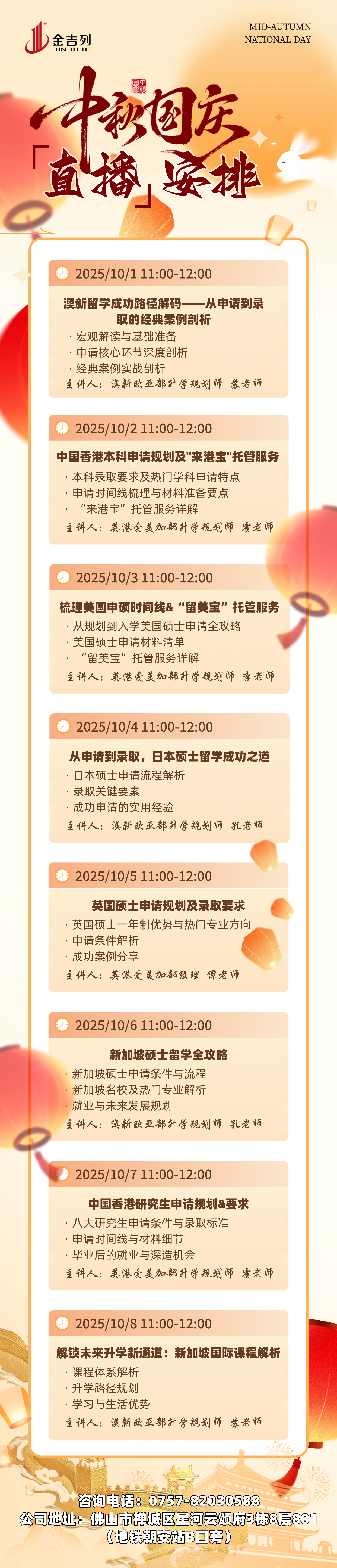 10月1日-10月8日,每天11:00-12:00,相约【金吉列留学佛山分公司】腾讯视频号!听留学时讯、做申请规划、获行前攻略、享海外生活,精彩多多,不容错过!
