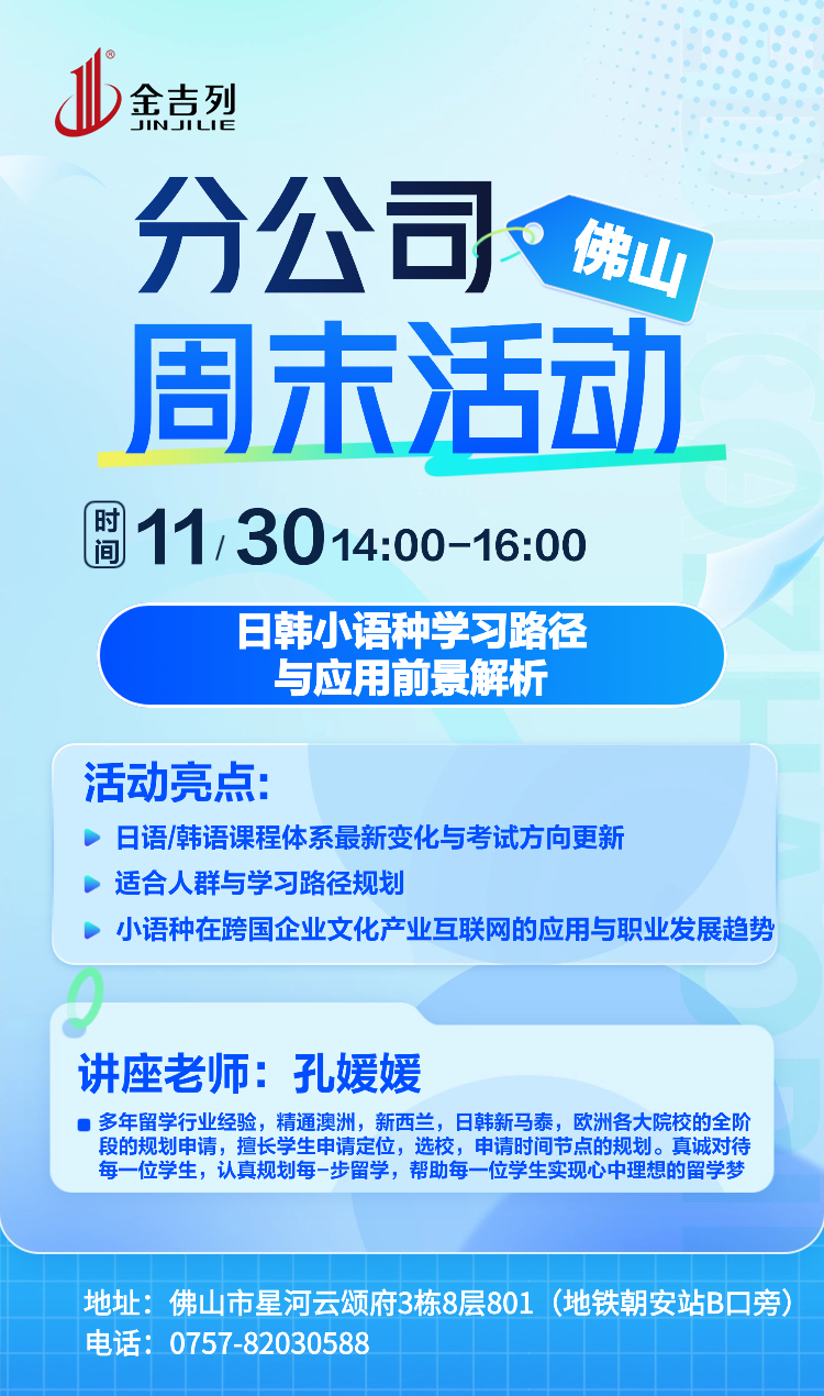 活动亮点: 日语/韩语课程体系最新变化与考试方向解析;适合人群与学习路径规划;小语种在跨国企业、文化产业、互联网/传媒领域的应用与职业发展趋势
