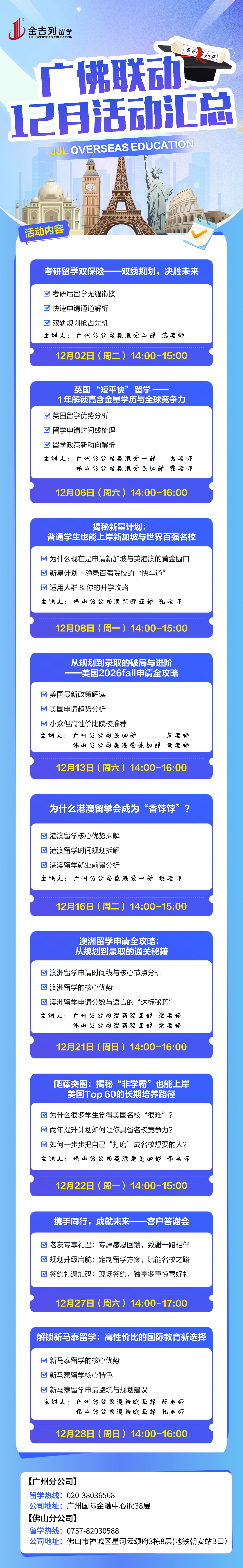 活动亮点: 以专业赋能梦想,以活动链接未来。12月精心策划并推出了一系列主题多元、内容扎实的留学活动,持续为学员们提供着超越期待的价值与陪伴。