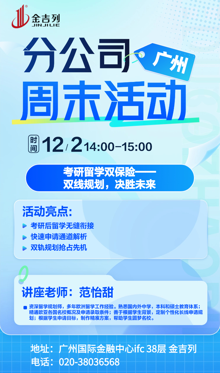 每周末13:00-18:00,相约金吉列留学广州分公司!听留学时讯、做申请规划、获行前攻略、享海外生活,精彩多多,不容错过!