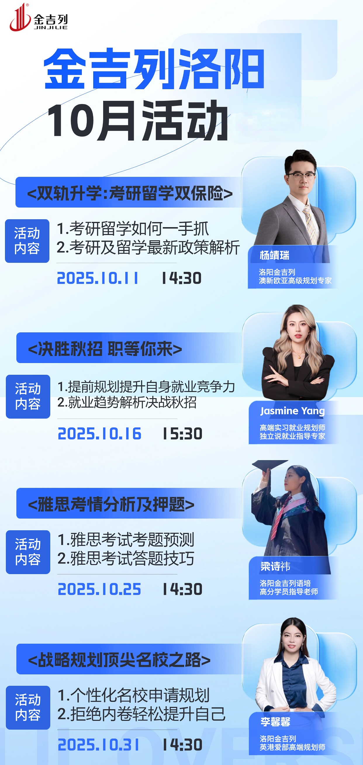 金吉列留学洛阳分公司2025年10月推出了一系列活动,感兴趣的小伙伴可以密切关注!!!