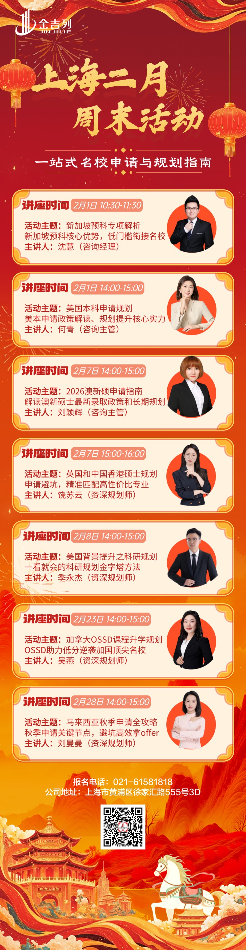 活动亮点: 新加坡预科专项解析、美国本科申请规划、2026澳新硕申请指南、26Fall最后冲刺英港留学、美国背景提升之科研规划、加拿大高中OSSD课程与升学规划指南、马来西亚秋季申请全攻略