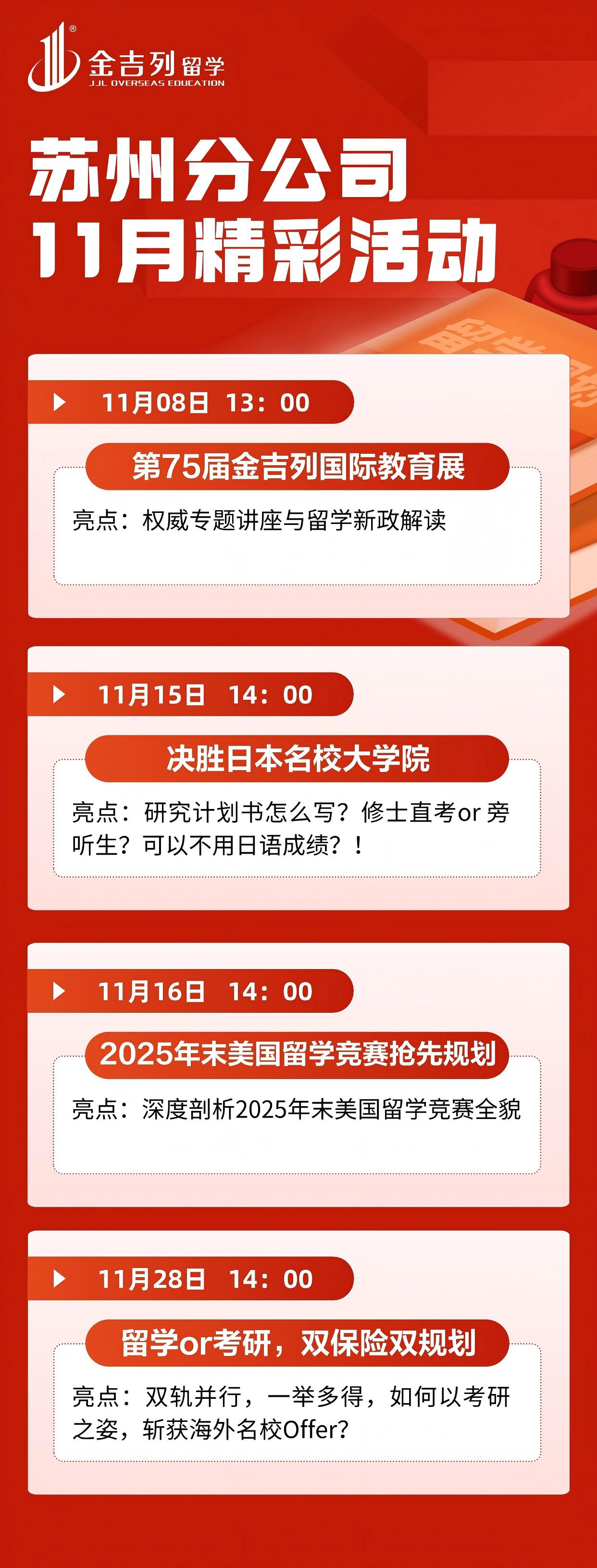 活动亮点: 第75届金吉列国际教育展、决胜日本名校大学院、2025年末美国留学竞赛抢先规划、留学or考研,双保险双规划