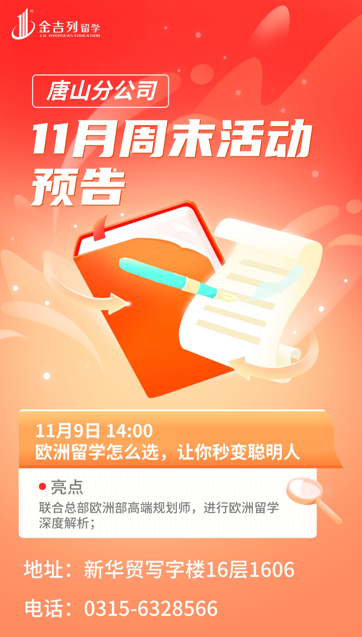讲座地点:唐山市路南区新华贸写字楼16层1606活动时间:2025-11-09 14:00