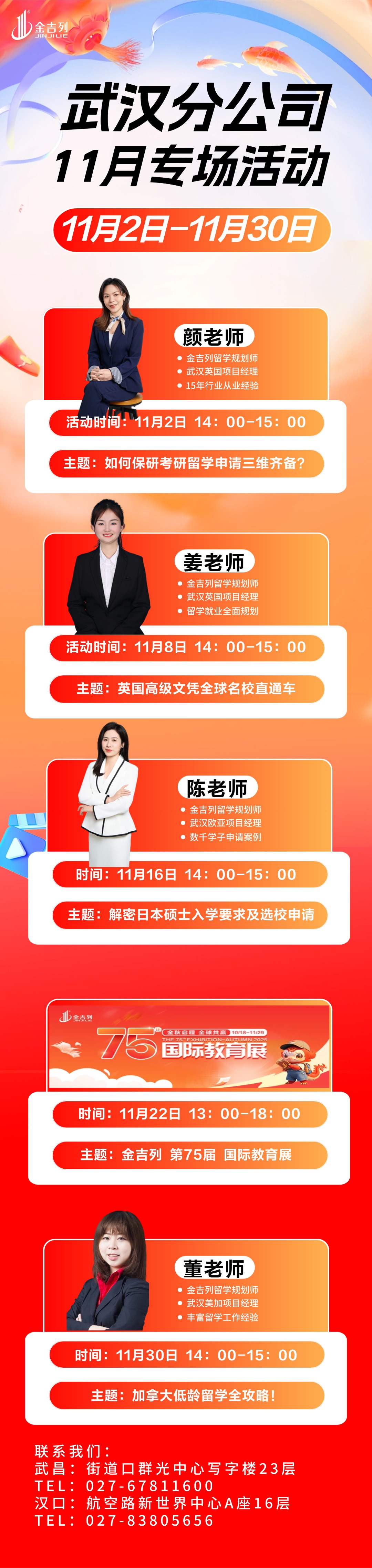 活动亮点: 金吉列75届国际教育展;考研留学双保险;英国名校直通车;日本硕士入学要求;加拿大低龄留学攻略