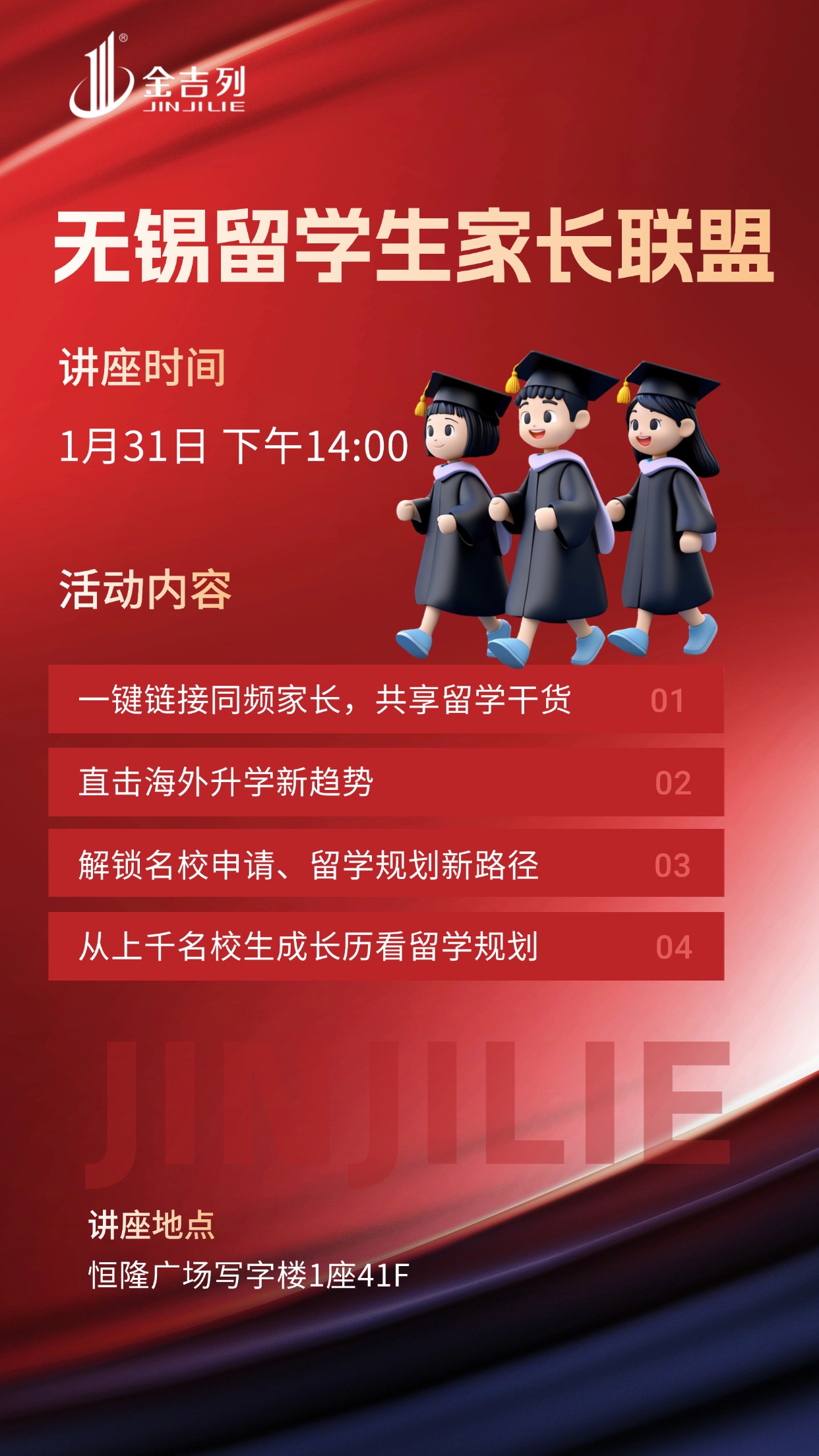 讲座地点:江苏省无锡市梁溪区恒隆广场写字楼1座41单元活动时间:2026-01-31 14:00