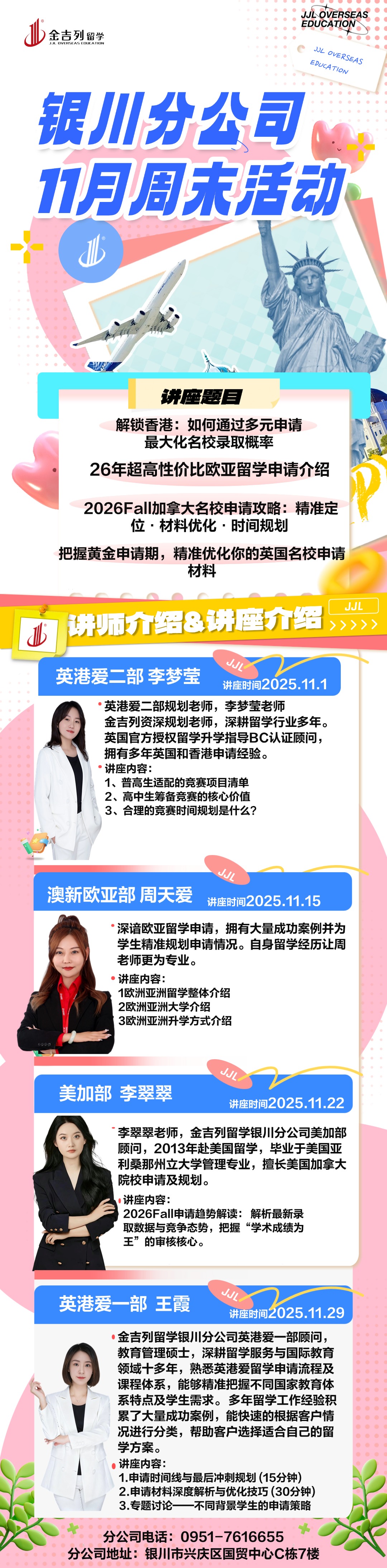 讲座地点:宁夏银川市兴庆区国际贸易中心C栋7楼金吉列留学活动时间:2025-11-01 09:00