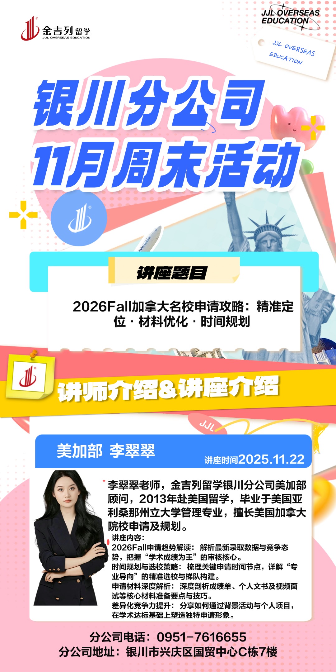 讲座地点:宁夏银川市兴庆区国际贸易中心C栋7楼金吉列留学活动时间:2025-11-22 09:00