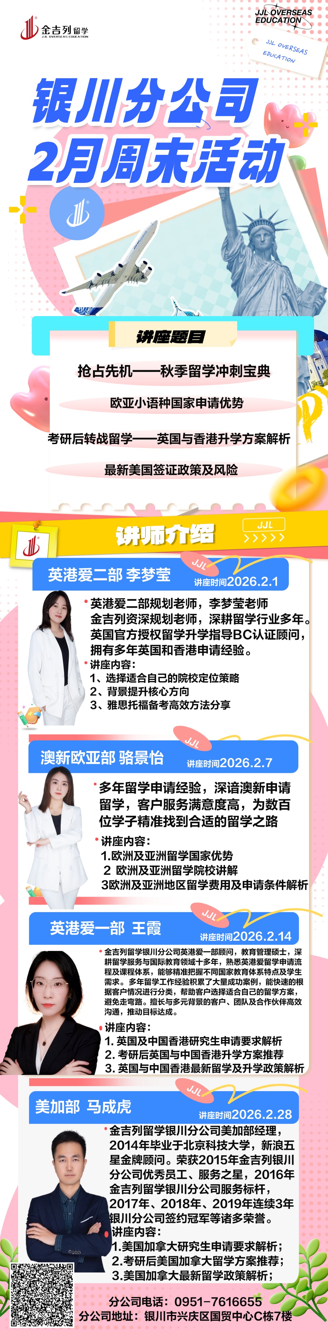 讲座地点:宁夏银川市兴庆区国际贸易中心C栋7楼金吉列留学活动时间:2026-02-01 09:00