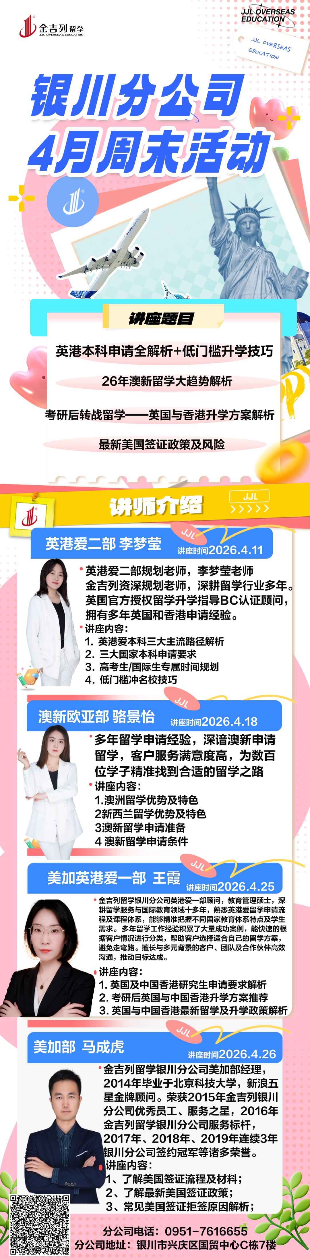 讲座地点:宁夏银川市兴庆区国际贸易中心C栋7楼金吉列留学活动时间:2026-03-23 09:00