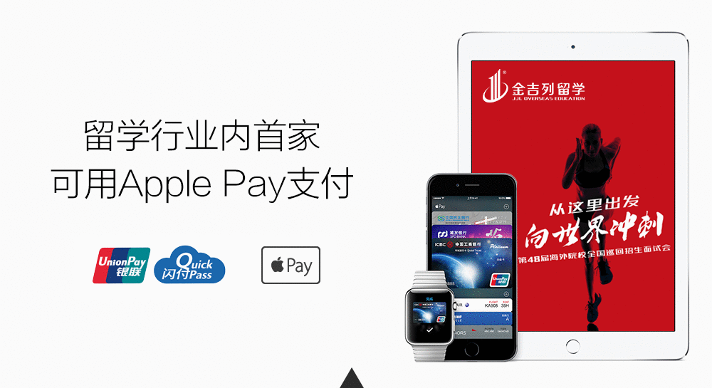 不久前,苹果公司在中国大陆正式上线Apple Pay移动支付服务,Apple Pay高调入华,在支付市场上掀起阵阵波澜。首批包括招商银行、建设银行、民生银行、工商银行在内的12家银行已宣布支持Apple Pay。2016金吉列留学“从这里出发,向世界冲刺”——第48届海外院校全国巡回面试会即将开始,届时您可在展会现场使用Apple Pay,让支付更加便捷。