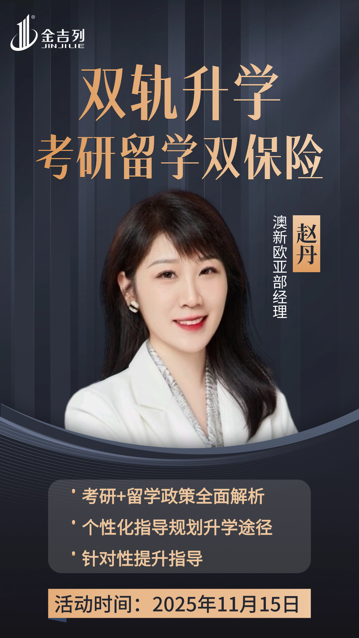 金吉列留学郑州分公司于2025年11月15日推出讲座活动《双轨升学:考研留学双保险》,活动安排了澳新欧亚经理赵丹老师为我们讲授:考研+留学政策全解析;个性化指导规划升学途径。
